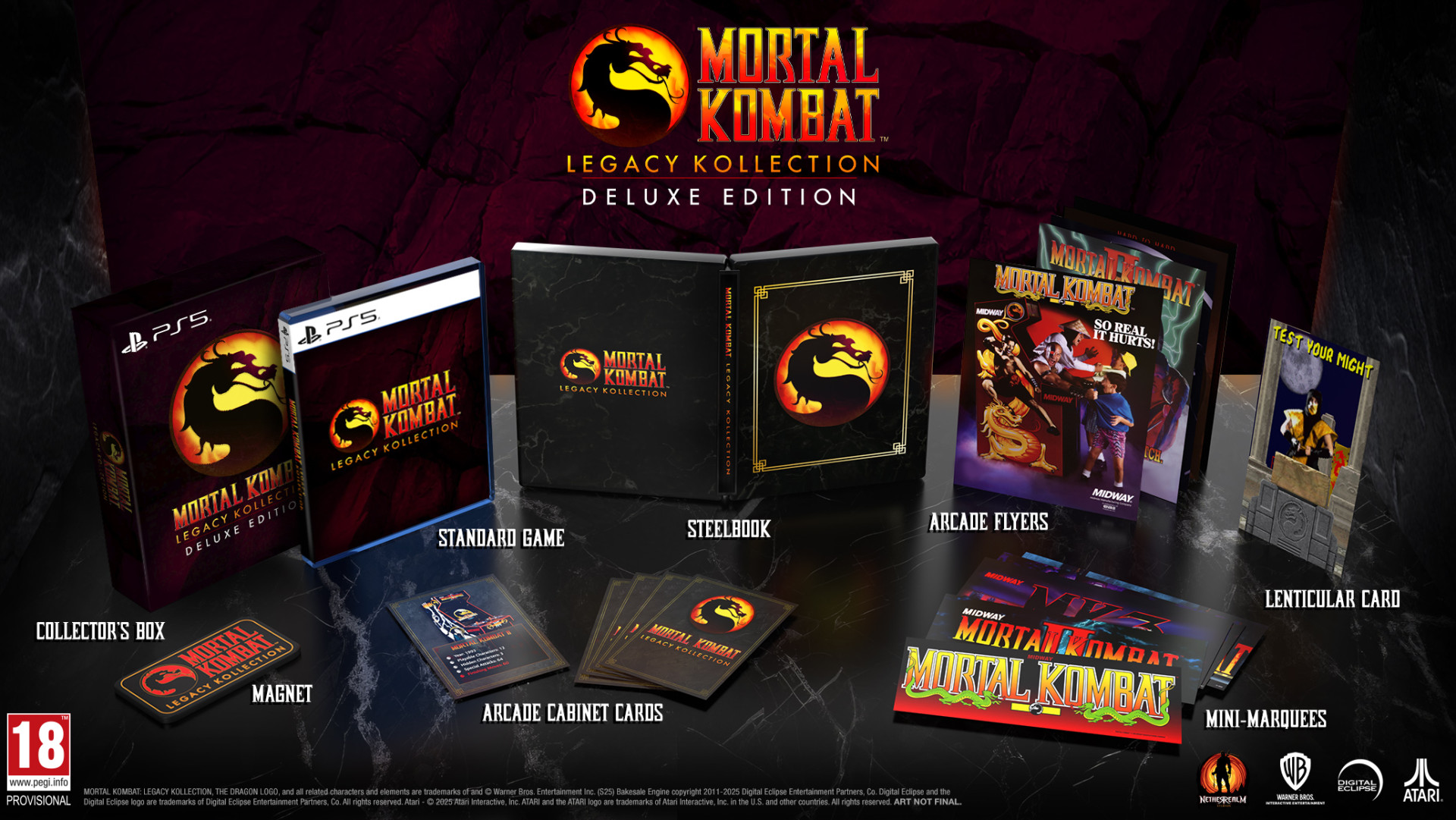 Test your might… in stijl.De ultieme collectie voor de echte krijger.Mortal Kombat Legacy Kollection Deluxe Edition brengt niet alleen de legendarische oorsprong van de franchise terug naar het scherm, maar doet dit in stijl met een exclusieve Steelbook en extra content die binnenkort onthuld wordt.Deze Deluxe-editie bundelt alle essentile Mortal Kombat-games uit de beginjaren in n explosieve verzameling. Van de originele arcade-knallers tot de meest geliefde thuisversies voor Super NES en Sega Genesis elke Fatality, elk gevecht en elke overwinning keert terug in hun meest pure vorm.Daarnaast ontdek je fan-favorieten en zeldzame releases op onder andere Game Boy, Game Gear, Sega 32X en Game Boy Advance. Een eerbetoon aan de grimmige, bloederige erfenis van een serie die de wereld op zn kop zette.Standaard meegeleverd1 x Mortal Kombat Legacy Kollection PS5 (blu-ray disc)1 x Mortal Kombat Legacy Kollection Steelbook5 x Mortal Kombat Arcade Cabinet Cards 5 x Mortal Kombat Arcade Flyers 5 x Mortal Kombat Mini Marquees 1 x Mortal Kombat Test your Might Lenticular card 1 x Mortal Kombat magneet 1 x Mortal Kombat posterHoofdkenmerken De oorsprong van Mortal KombatSpeel een uitgebreide selectie van iconische arcade-versies, klassieke console-edities en zeldzame handheld-releases. Online gevechten met rollback netcodeStrijd tegen vechters wereldwijd met strakke respons en stabiele connectie elke slag is raak. Geen geheimen meerOntgrendel alles direct geheime personages, ontwikkelaarsmenus, verborgen instellingen speel de game op jouw manier. Interactieve documentaireBeleef het verhaal achter Mortal Kombat via een diepgaande digitale ervaring met interviews, concept-art, vintage reclame en meer. Het volledige verhaalVolg de evolutie van de franchise via uitgebreide tijdlijnen en karakterprofielen van Earthrealm tot Edenia.Voor de fan die niets aan het toeval overlaat. Verzamel. Vecht. Overleef.Mortal Kombat Legacy Kollection Deluxe Edition is jouw toegang tot de dodelijke geschiedenis.