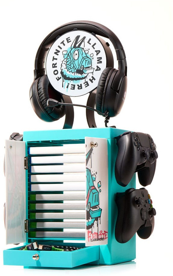 Llama, llama, loot, loot!De iconische lama uit Fortnite is getransformeerd tot een container voor gaming-accessoires. Deze gaming locker heeft een opvallend ontwerp dat een eerbetoon is aan de geliefde lama en is de perfecte manier om al je games en accessoires netjes en georganiseerd te houden.De locker is ontworpen om zo min mogelijk ruimte in te nemen, maar biedt maximale opbergruimte. Achter de deuren met het Fortnite-logo vind je verstelbare planken, waar je tot wel 10 games of films kunt opbergen. Aan de zijkanten kun je tot vier controllers ophangen en aan de onderkant is een lade voor kabels, afstandsbedieningen en andere accessoires. Officieel product Dit is een officieel gelicenseerd Fortnite-product, ontworpen en vervaardigd door Numskull Designs. Verstelbare planken De planken aan de binnenkant kunnen worden aangepast om aan je specifieke behoeften te voldoen. Headsethouder Aan de bovenkant bevindt zich een veilige plek om je headset te bewaren. Ruimtebesparend ontwerp Dankzij het slimme ontwerp past de locker gemakkelijk in elke gaming-opstelling.Ben je klaar om al je loot op te bergen in deze epische gaming locker?