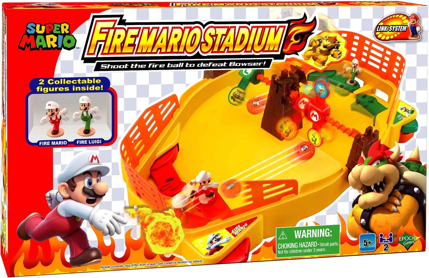 Schiet op het doelwit van je personage om aan te vallen! Gebruik de 2 zijflippers om op de Fire Ball Disk te schieten! Elke treffer zorgt ervoor dat je doelwit naar Bowser kantelt en verslaat wanneer het de toren bereikt. Schiet tegelijkertijd op het doelwit van je tegenstander om te onderbreken Als je het doelwit van de tegenstander raakt, draait het de andere kant op om weg te blijven van de toren.Welke zal winnen?- Officile Licentie- Formaat verpakking 51 x 30cm- Bevat 2 figures