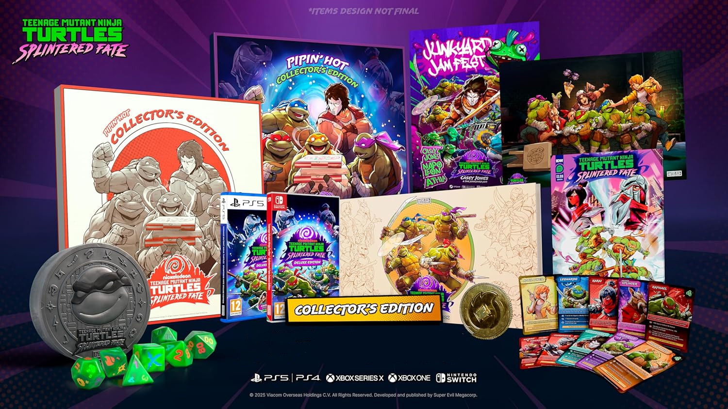 Ontketen de Turtle Power! Pak je vrienden, kies je favoriete Turtle en duik in een roguelike avontuur om Master Splinter te redden van de Foot Clan! Beheers ninja-vaardigheden, verenig je in geweldige online en lokale co-op gameplay, en verover iconische locaties in New York City!De PipinHot Collectors Edition bevat Mutant Ooze Green Tabletop RPG DiceGebruik ze om je co-op personage te kiezen,krachtboom of zelfs pizza toppings tijdens een co-op sessie op de bank met je vrienden! Ze zijnook compatibel met andere TTRPG spellen. NYC Riolering Manhole Cover Dice BoxBewaar je dobbelstenen veilig inechte Turtle-stijl. 50-Paginas Art Book & Retro ManualMet geweldige gamekunst en tips voor je runs.Verpakte folie van 10 Exclusieve Verzamelkaartenmet kunst van de hoofdpersonages,bondgenoten en vijanden. Dubbelzijdige metalen muntDe ene kant is een Dreamer Coin, de andere een Dragon Coin. TMNT Splintered Fate Comic van IDW Publishingeen juweeltje voor verzamelaars! Twee Exclusieve PostersMet je favoriete Turtles en Casey Jones. Perfect om je Lair teversieren. Een pizza doos gewikkeld ineen full-color sleeveeen door de Turtles goedgekeurdeverpakking voor deze editie. En natuurlijk,de game doos en discspelcartridge, inclusief de Casey Jones DLCIn Splintered Fate moet je voorbereid zijn op snelle, roguelike actie waarbij geen twee potjes hetzelfde zijn. Willekeurige power-ups, kamerindelingen en eindbaas-modifiers zorgen voor extra veel plezier. Kruip in de huid van alle vier de Turtles, elk met unieke krachten en vaardigheden, en werk samen met vrienden voor waanzinnige cop-gameplay. Verken iconische locaties in New York, verbeter je Turtle-krachten en bereid je erop voor te vechten tegen ontzagwekkende vijanden.Deze editie bevat de veelgeprezen Casey Jones & the Junkyard Jam-uitbreiding! Met een nieuw speelbaar personage, het Junkyard-niveau, nieuwe bazen, vijanden en meer! En dat is nog niet alles elke Deluxe Editie bevat een pack met tien officile verzamelkaarten. (Zolang de voorraad strekt!)